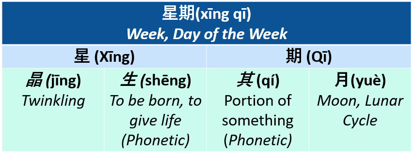 It is made up of two compound characters: first is 星 (comprised of a simplified combination of 晶 and 生) and second is 期 (a combination of 其 and 月).