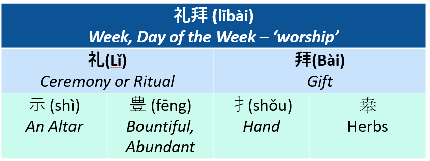 The third, far more informal (though commonly used) term is 礼拜 (lǐ bài). The term is a combination of 礼 (lǐ) and 拜 (bài). 礼 (lǐ) is in turn a combination of 示 (shì) and 豊 (fēng).1 拜 (bài) is a combination of 扌(shǒu) and 𠦪 (unknown pronunciation).