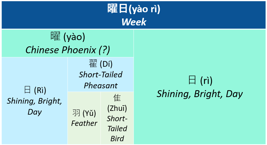 - This is absolutely my own interpretation (IMO). I have not been able to find a good interpretation of what 曜 (yào) or 曜日 (yào rì) mean or why they are what they are. If you have a better explanation, please drop it in the comments! It appears to be a “sun” + “long-tailed pheasant” and looking up the terms brings up the fenghuang (Chinese Phoenix). This does make sense to me. . . the bird matches the description of the two terms (short wings like a swallow with extra special feathers, linked to the sun and other celestial concepts). I can see how they would connect the sun moving across the sky to a fiery bird soaring in the heavens. If I’m wrong, at least it makes sense in my trying to remember the characters 😂 ↩︎