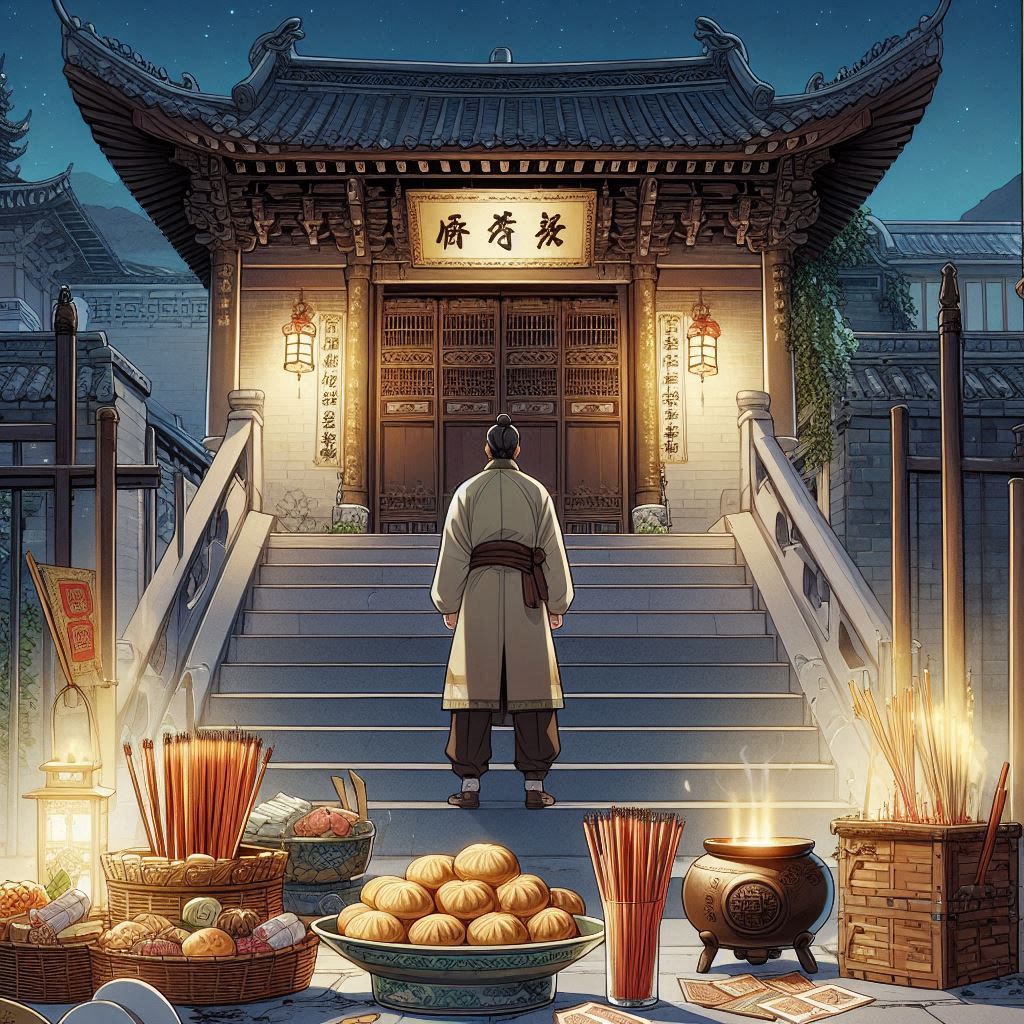 The incense sticks in front of Yue Temple, the paper ashes and offerings. . . it was Hé Tàijì who, when he ousted the students between 11 pm-1 am26, ordered the servants to clear them away. As for the iron lock on the door, presumably it was also Hé Tàijì who locked it? Sòng Cí could not enter Yue Temple, so he was forced to offer his sacrifices outside the door. He lit the incense sticks, set up the steamed buns, and knelt on the stairs facing the Yue Temple plaque while sincerely kowtowing. He then picked up the paper money and burned it inside the brazier.